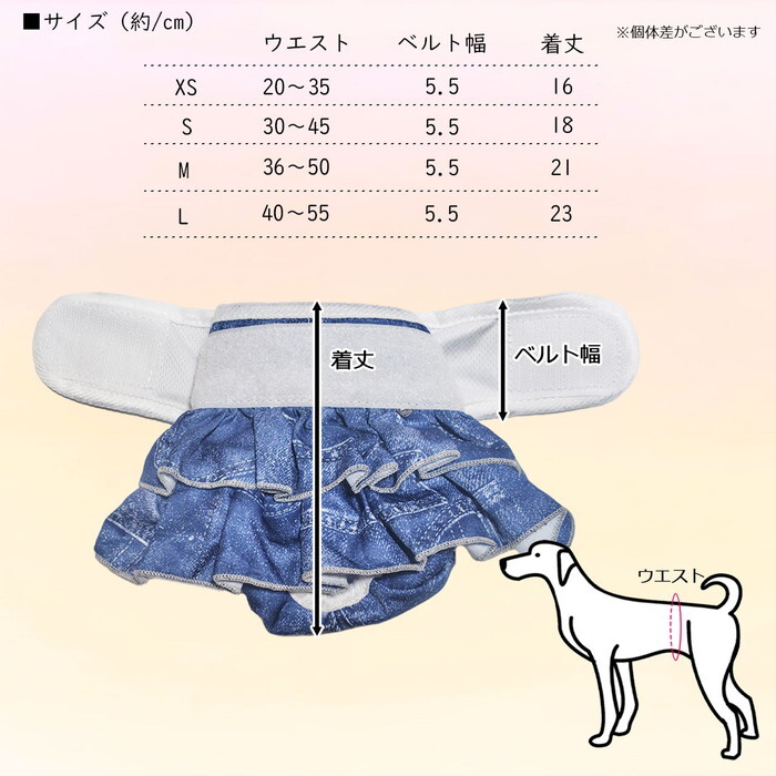 2段のフリルでマナーパンツを可愛く★ 生理(ヒート)やマーキング防止、トイレトレーニングなどの他 老犬の介護やお出かけなどに活躍します。 5層構造で安心度アップ♪ 着脱は面ファスナーで手間がかからずラクラク 内側は柔らかいソフトメッシュ素材で、肌触りがよくて通気性抜群 表地はスルッと滑らかな手触りです。 (※デニム素材ではございません。) 腰まわりや足まわり、しっぽ部分には伸縮ゴムが入っているため、 ペットの体によりフィットします。 ※ご注意 個体差や着用状況によって出血量・尿量等に ばらつきがありますので、 多い子はペット用のパットや人間用のナプキンなでどの 併用をお願いします。 また尿・便の量によっては、脚やお腹のすきまより漏れる可能性がございます。 最初のうちは特に、ペットの様子を見ながらご使用ください。 【サイズ/約cm】 XS:ウエスト20~35 着丈16 S:ウエスト30~45 着丈18 M:ウエスト36~50 着丈21 L:ウエスト40~55 着丈23 ※個体差がございます 【材質】 ポリエステル、コットン他 #小型犬 #超小型犬 #ネコ #犬服 #猫服 #犬用マナーパンツ #犬用 #サニタリーパンツ #犬用パンツ #犬用生理パンツ #犬用オムツカバー #女の子 #発情期用 #通気性 #吸水性